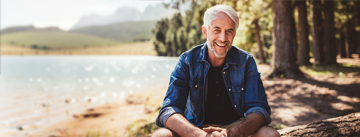 Portrait of a happy mature man sitting near a lake looking at camera and smiling. The senior caucasian man is sitting on a log by the lake on a summer day. Concept of healthy senior lifestyle and outdoor camping and living.