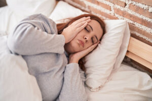 Young beautiful plus size woman stressed lying on bed at bedroom